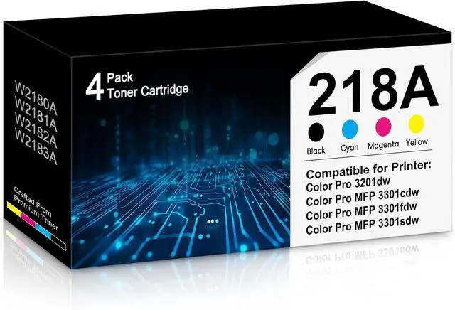 Product Name: 218A Toner Cartridges 4 pack compatible for HP 218A 218X 218 toner cartridges Color Jet Pro MFP 3301fdw toner cartridges, Color Laser Jet Pro MFP 3301sdw toner cartridges, Color Laser Jet Pro 3201dw toner cartridges, Color Laser Jet Pro MFP 3301cdw toner cartridges;