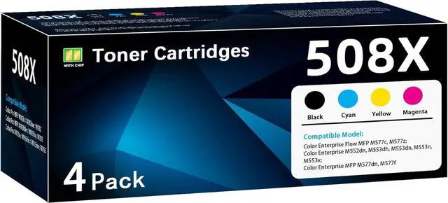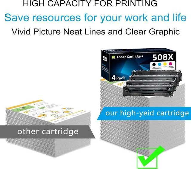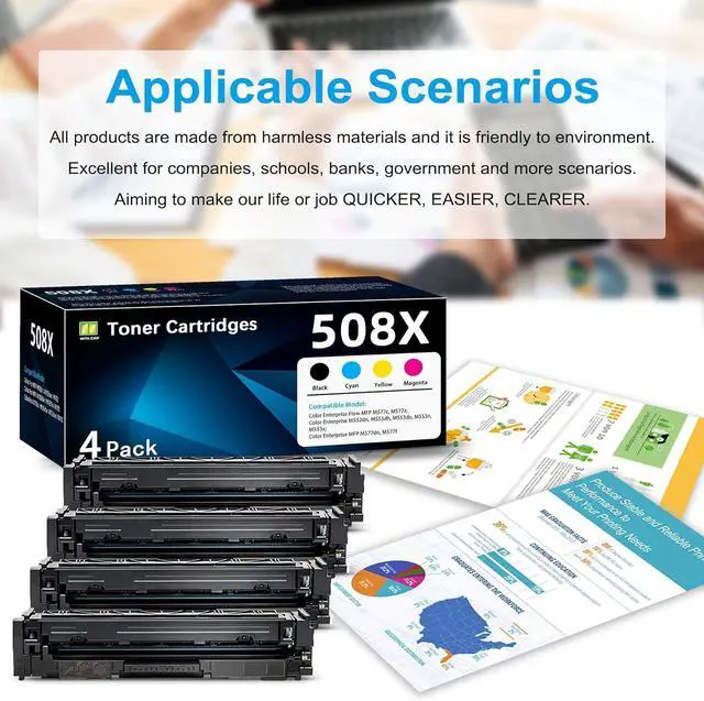 Our 508A 508X Toner Cartridges 4 pack Set, 4-pack with generous capacity, providing durable long-term printing performance and cutting down on replacement times. The specialized toner blend guarantees clear, natural, and vibrant prints, and reliably stops toner from leaking