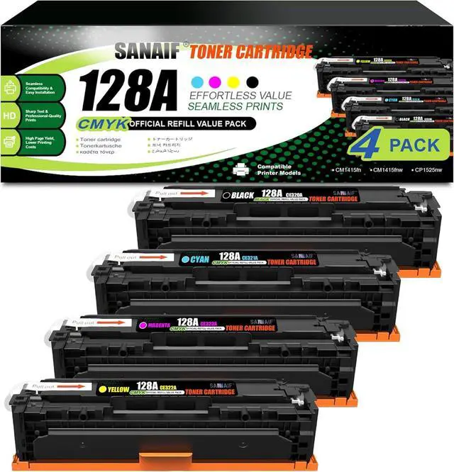 What's in the box: 128A Set 4 Packs includes 1 x Black(CE320A) Toner,1 x Cyan(CE321A) Toner,1 x Magenta(CE323A) Toner,1 xYellow(CE322A) Toner