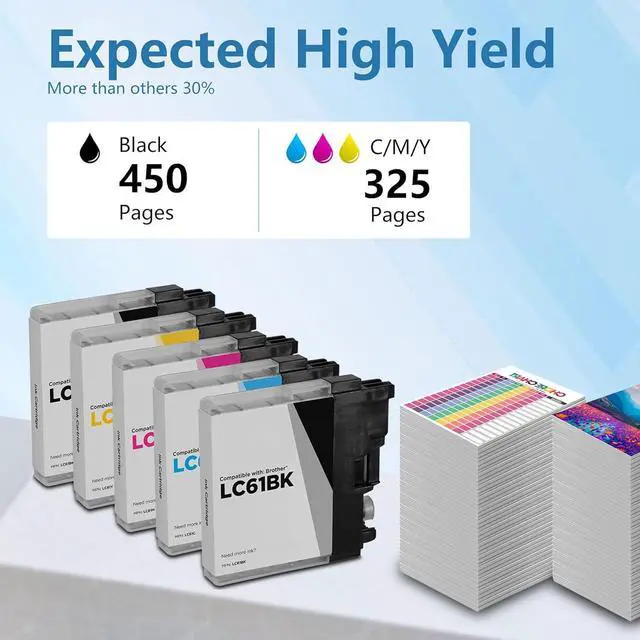 High Page Yield & Cost Efficiency: A single LC61 black ink cartridge delivers up to 450 pages, and each color LC61 cartridge up to 325 pages (based on 5% page coverage). Significantly reduce your cost per page compared to OEM brands
