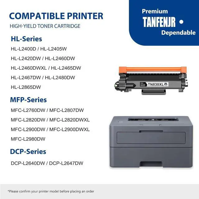 Compatible Printers: HL-L2400D HL-L2405W HL-L2420DW HL-L2460DW HL-L2460DW XL, HL-L2465DW HL-L2467DW HL-L2480DW HL-L2865DW; MFC-L2760DW MFC-L2807DW, MFC-L2820DW MFC-L2820DWXL MFC-L2900DW MFC-L2900DW XL MFC-L2980DW; DCP-L2640DW DCP-L2647DW Printer