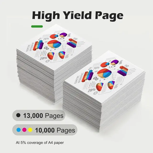 Page Yield: Up to 13,000 pages per black toner cartridge and 10,000 pages per color toner cartridge at 5% coverage (A4/Letter)