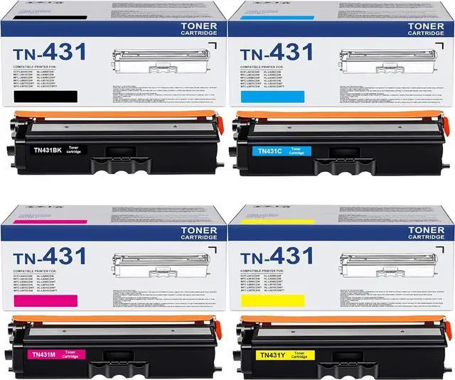 Package Contents: 1 x Black TN431BK Toner, 1 x Cyan TN431C Toner, 1 x Magenta TN431M Toner, 1 x Yellow TN431Y Toner (TN431 4-Color Toner Cartridge Set)