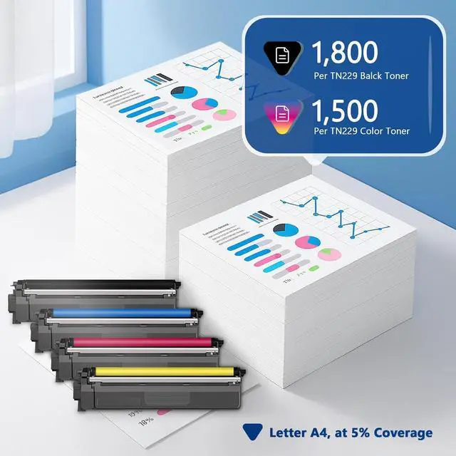 Print the number of pages: Up to 1,800 Pages per TN229 Black Toner Cartridge print, Up to 1,500 Pages per TN229C TN229M TN229Y Toner Cartridge print (based on 5% coverage)
