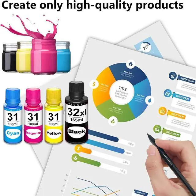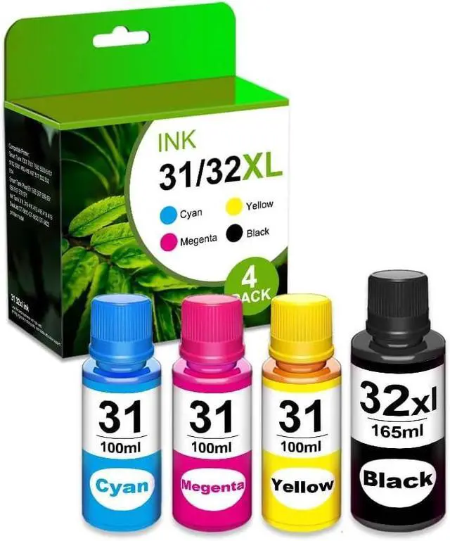Package Contents: 4 Pack 31 / 32XL Ink Bottle(1*Black, 1*Cyan, 1*Magenta, 1*Yellow)