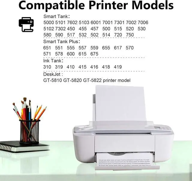 Compatible Printer: Smart Tank 5000 5101 7602 5103 6001 7001 7301 7002 7006 5102 7302 450 455 457 500 515 520 530 580 590 517 532 502 514 720 750; Smart Tank Plus 651 551 555 557 559 655 617 570 571 578 600 615 675; Ink Tank 310 319 410 415 416 418 419; DeskJet GT-5810 GT-5820 GT-5822 Printer