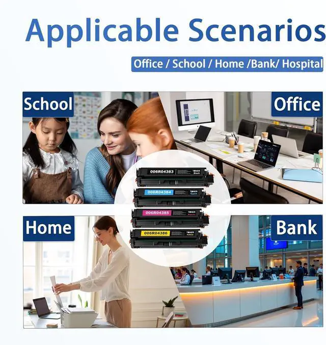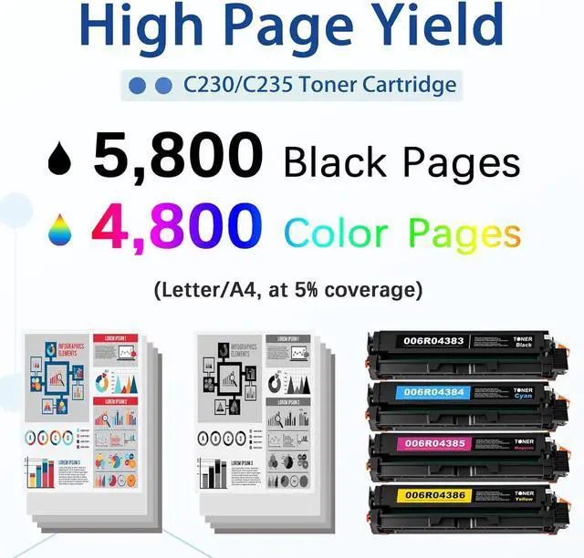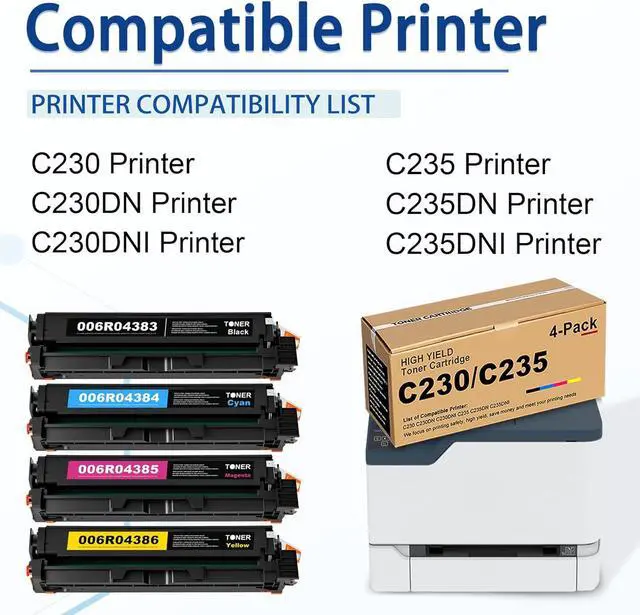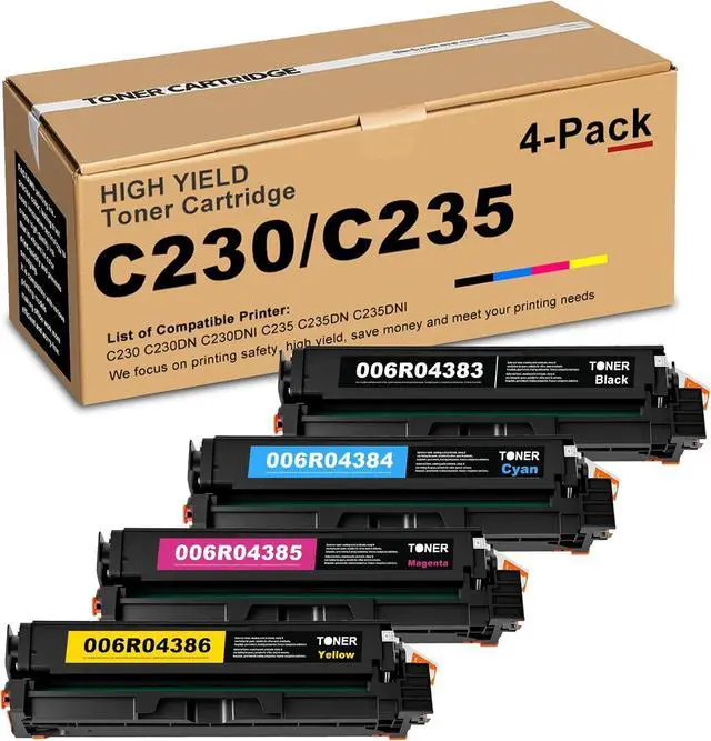 • Packaging Content: 4 Pack High Yield C230 C235 Toner Cartridge, 006R04383 Toner Cartridge (Black), 006R04384 Toner Cartridge (Cyan), 006R04385 Toner Cartridge (Magenta), 006R04386 Toner Cartridge (Yellow)