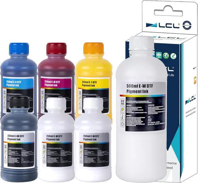 Package Includes: 7 DTF ink cartridges. Capacity: 500ML White x 1, 250ML White x 2, 250ML Black x 1, 250ML Cyan x 1, 250ML Magenta x 1, 250ML Yellow x 1 ,Instruction x 1, Glove x6, Syringe x6