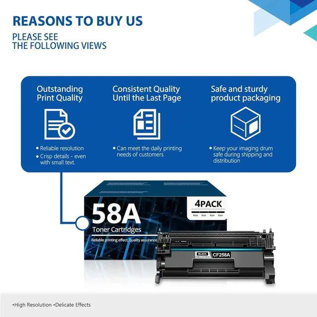 Contents: 4 Pack Black 58A | CF258A Toner Cartridge.