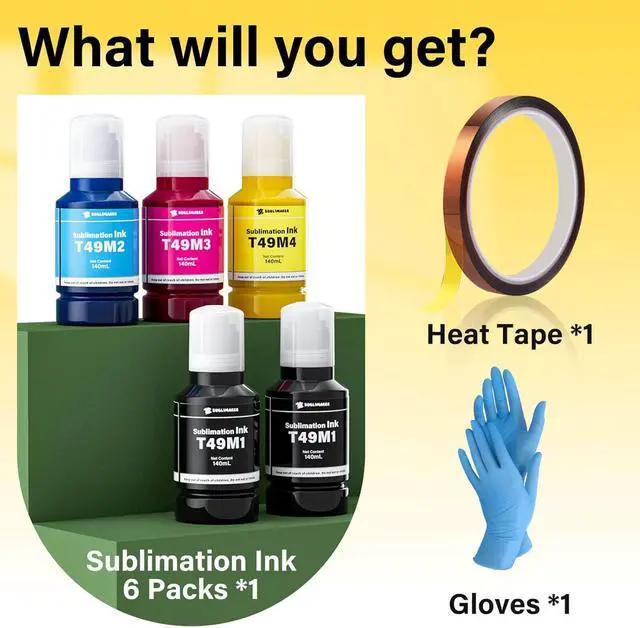 Whats in the box: 5 Pack sublimation ink (Black, Cyan, Magenta, Yellow, 140ml each), 1 heat tape, 1 pair of gloves.