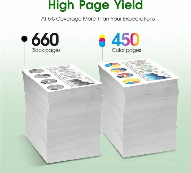 XL Ink: for HP 62xl black/tricolor high yield ink cartridges, 660 pages per 62xl black ink cartridge and 450 pages per color ink cartridge (at 5% coverage, A4 paper size)
