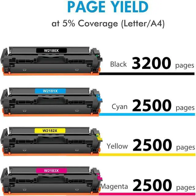 Page Yield: Up to 3,200 pages for 218X black toner with chip and 2,500 pages for per 218X color toner with chip (Letter/A4, at 5% coverage)