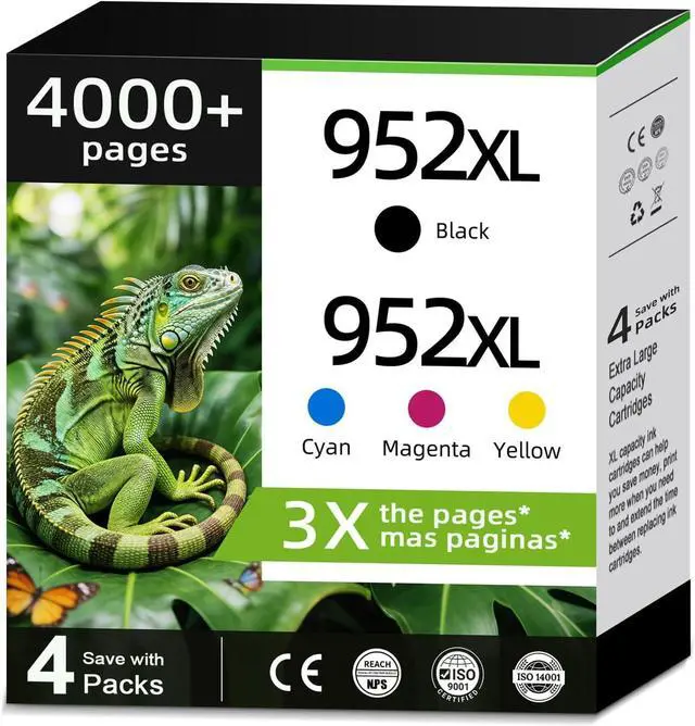 What's in the box: 1 New Extra Capacity Cartridge 952 pack of 4 ink cartridges: 952XL Black ink cartridge, 952XL Cyan ink cartridge, 952XL Magenta ink cartridge, 952XL Yellow ink cartridge and a user guide