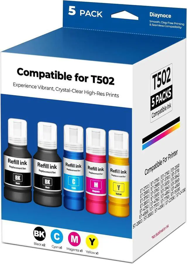 Complete Multipack Includes 2 x black T502 ink , 1 x cyan ink, 1 x magenta T502 ink, 1 x yellow T502 ink, high-yield ink bottles for long-lasting printing. No chips or cartridges neededrefill directly. Not sublimation ink)