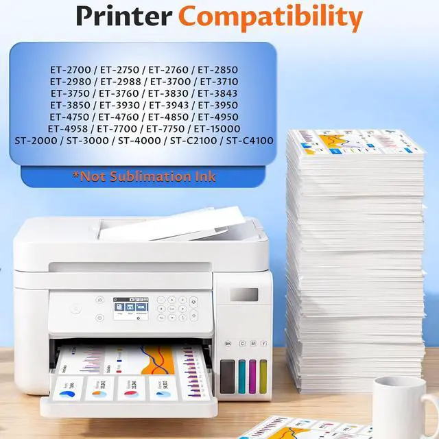 Compatible Printers: for ET-2850 ink refill bottles, ET-3850 ink refill bottles, ET-4850 ink refill bottles, ET-15000 ink refill bottles, ET-2700 ink refill bottles, ET-2750 ink refill bottles, ET-2760 ink refill bottles, ET-2980 ink refill bottles, ET-2988 ink refill bottles, ET-3700 ink refill bottles, ET-3710 ink refill bottles, ET-3750 ink refill bottles
