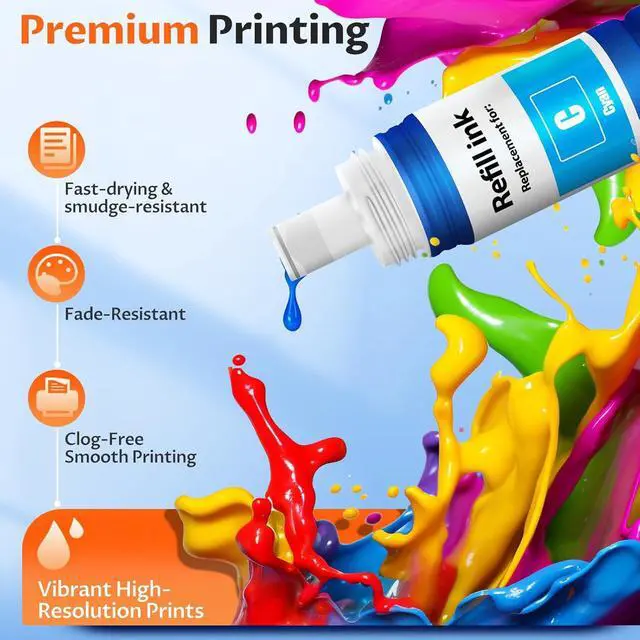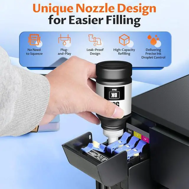 Easy & Mess-Free Refill: Precision nozzles prevent spills; each bottle fills the tank in seconds. Extra-large capacity with 10,000+ black / 8,000+ color pages per set.