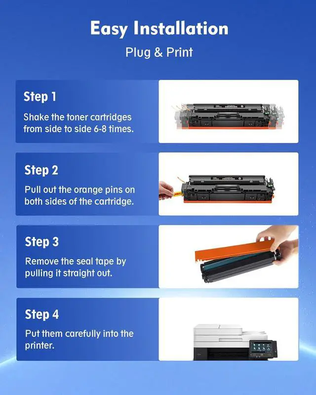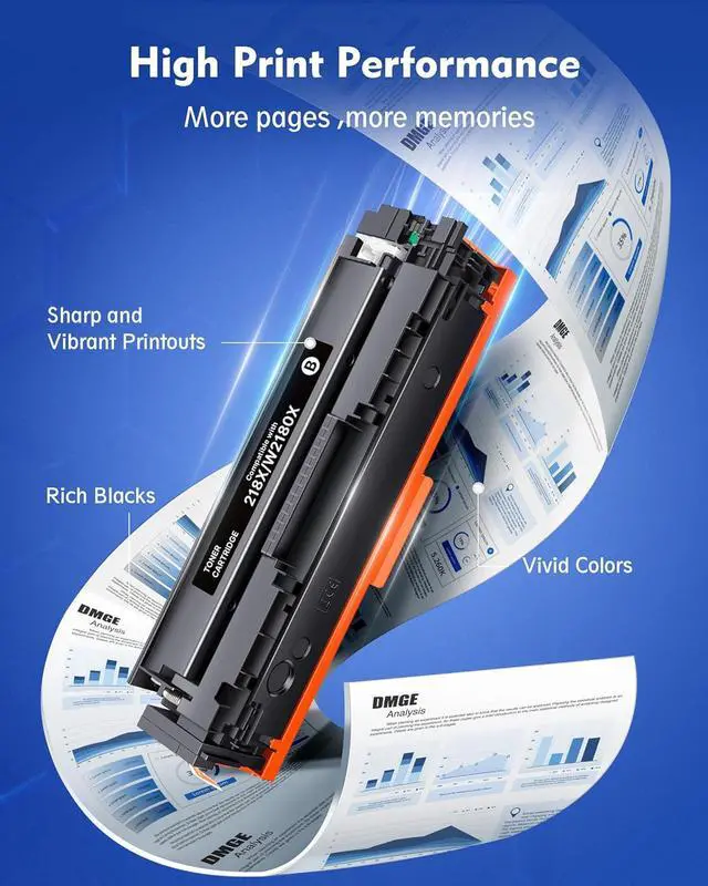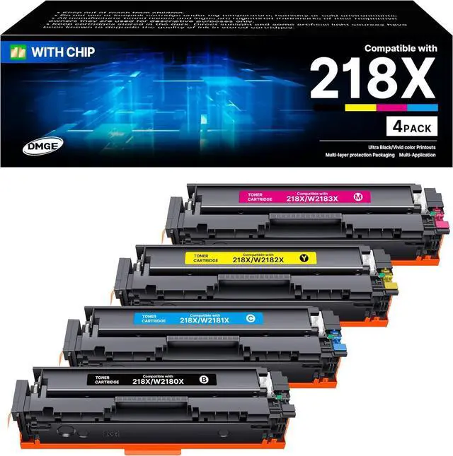 With Upgraded Chips: 218x toner cartridges 4 pack replacement for hp 218x with upgraded chipes inside compatible for hp color laserjet pro mfp 3301fdw toner are equipped with chips for hassle-free printing experience. No need to remove and install old chips on this replacement for hp218x. Compatibility: 218x replacement for hp 218x hp218a compatible with HP color pro mfp 3301fdw 3301cdw 3301sdw printer, color pro 3201dw printer Page Yeild: 218x for hp 218x up to 3200 pages per black w2180x toner cartridges and up to 2500 per color toner cartridges(w2181x/w2182x/w2183x) Inclueded: Inlcueded 218x replacement for hp 218x toner cartridges 4 pack high yeild with chip(1 x black w2180x toner, 1 x w2181x cayn toner, 1 x w2182x magenta toner, 1 x w2183x yellow toner) Reliable Performance: DMGE for hp 218x hp218a toner cartridges 4 pack is manufactued in ISO 9001 and ISO 14001 standard facilities, ensuring vibrant colors and stable quality printouts