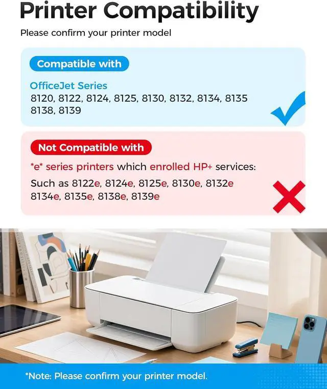 Compatible PrintersCompatible for HP OfficeJet Pro 8120, 8122, 8124, 8125, 8130, 8132, 8134, 8135, 8138, 8139Compatible withwith HP OfficeJet Pro 8122e, 8124e, 8125e, 8130e, 8132e, 8134e, 8135e, 8138e, 8139e PrinterNot Compatible withNot Compatible *e* series printers that have enrolled in services ( Instant Ink program) E-Series Such as8122e, 8124e, 8125e, 8130e, 8132e, 8134e, 8135e, 8138e, 8139e. Please Check your Printer model before place your order! 923E Ink Cartridges for Printer