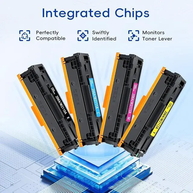 Package Contents:4 Packs 206A toner cartridges set contain 1 x W2110A 206A black toner cartridge black , 1 x W2111A 206A cyan toner cartridge, 1 x W2112A 206A yellow toner cartridge, 1 x W2113A