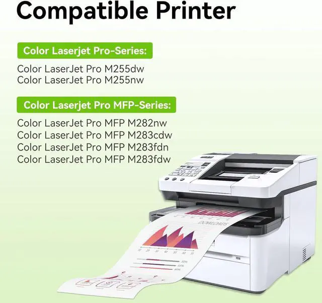 Printer Compatibility: Compatible with HP Color LaserJet Pro MFP M283fdw, MFP M283cdw toner, MFP M283fdn, MFP M282nw toner cartridges, Color LaserJet Pro M255dw, M255nw, M283 M282 M255 Series Printers.