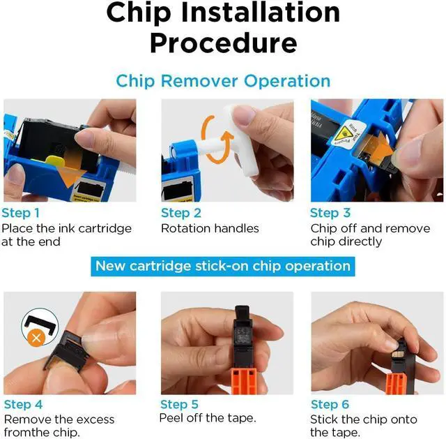 Installation Steps: First, please use our tool to remove the original chip from the ink cartridge. The second step is to remove the tape of the new compatible cassette tape and stick the chip onto the tape. Finally, if you have any questions about our 923 923e ink cartridges, please feel free to contact us at any time!
