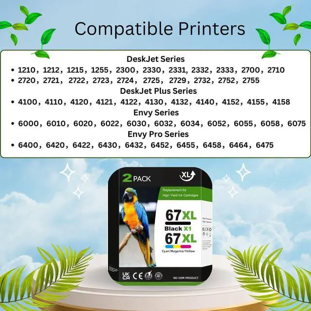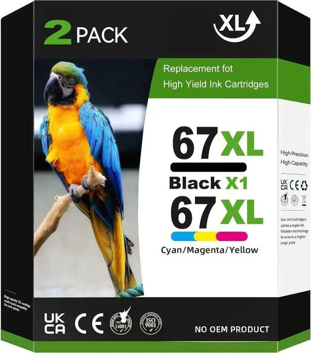 Package Contains: 2 Pack 67xl ink cartridges.1 x 67XL black ink cartridge for hp 67xl black ink cartridge, 1 x 67XL color ink cartridges for hp 67xl color ink cartridge(This is Not an OEM product)