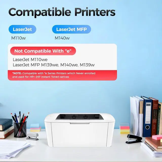 Note: Please check your printer model before ordering.Not compatible with "E" series, Laser Jet M110we M139we M139 M140we Printer. Don't activate and update the compatible for HP+ Program. Program activation will cause the compatible toner cartridge to be unrecognized