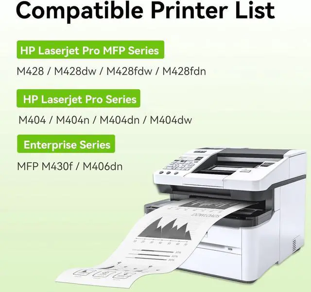 Printer Compatibility: Compatible with HP LaserJet Pro MFP M428dw, MFP M428fdn, MFP M428fdw toner, Pro M404dn, M404dw, M404n toner cartridges, Enterprise M406dn, MFP M430f, M404 M428 M406 M406dn Series Printers.