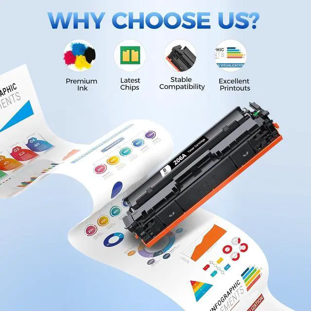 Package: 4 packs with upgraded chip color toner cartridges compatible for HP-206A (1* W2110A black toner, 1* W2111A cyan toner, 1* W2112A yellow toner, 1* W2113A magenta toner)