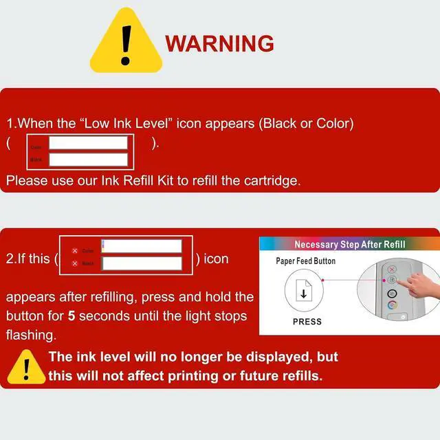 1.Refill when Low Ink Level appears. Ink level wont display after refill, but printing is not affected.