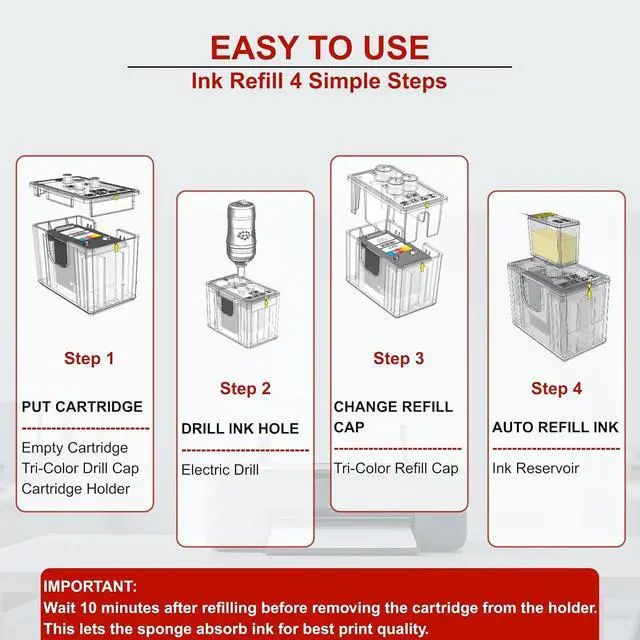 Please wait 10 min after refilling before removing the cartridge from the holder. This allows the ink to saturate the sponge and ensures optimal print quality.
