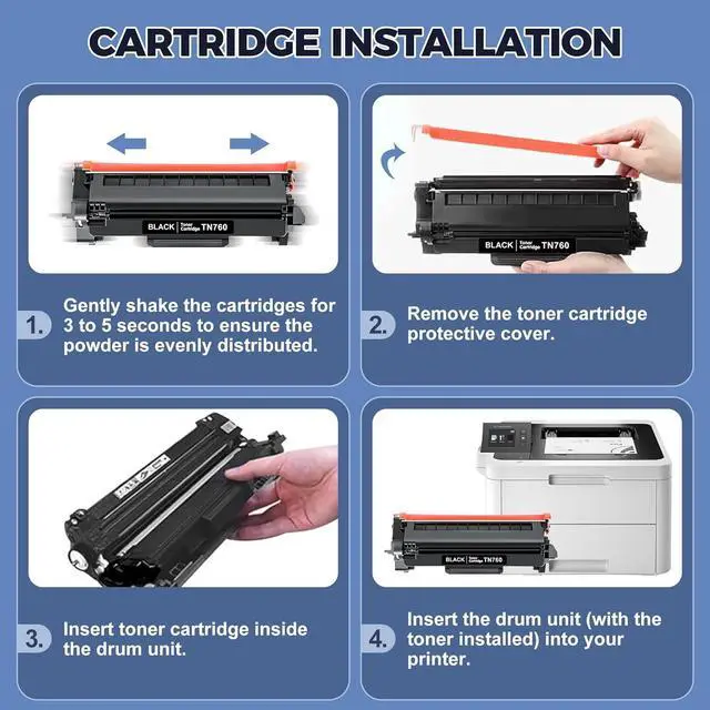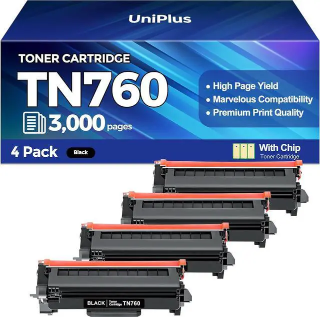 Package Includes: 4 x Compatible TN760 Black Toner Cartridges, perfectly replacing TN-760 TN-730 toner cartridges.
