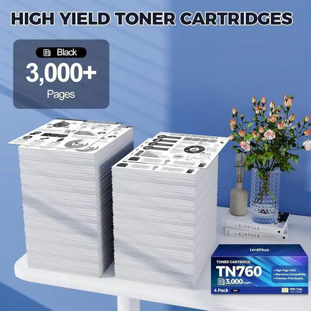 High-Yield Performance: Each TN760 black toner cartridge delivers up to 3000 pages (based on Letter/A4 paper, 5% coverage). 4-pack total yield reaches 12,000 pages, meeting large-volume printing needs.