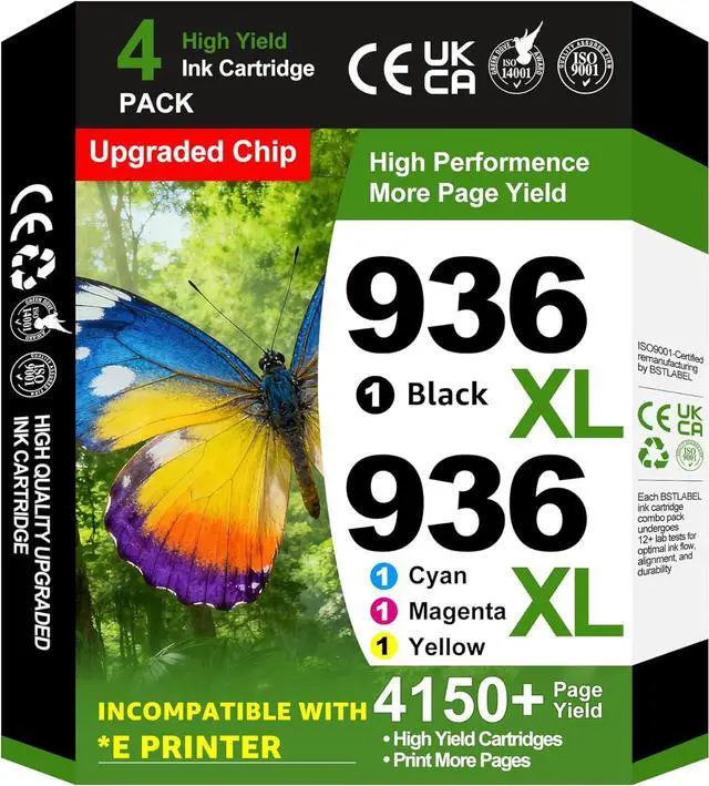 Package Contents: 1 x 936XL 936e High-Yield Black Ink Cartridge, 1 x 936XL 936e High-Yield Cyan Ink Cartridge, 1 x 936XL 936e High-Yield Magenta Ink Cartridge, 1 x 936XL 936e High-Yield Yellow Ink Cartridge 4-pack in total, perfect for high-volume printing needs.