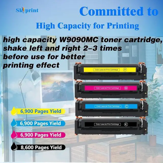 SkyPrint W9090MC toner cartridges come with intelligent chips that automatically recognize and provide printing, Not damaging the machineShake the toner cartridge horizontally 2-3 times before use to evenly distribute the toner,providing you with better clear and natural printing effects