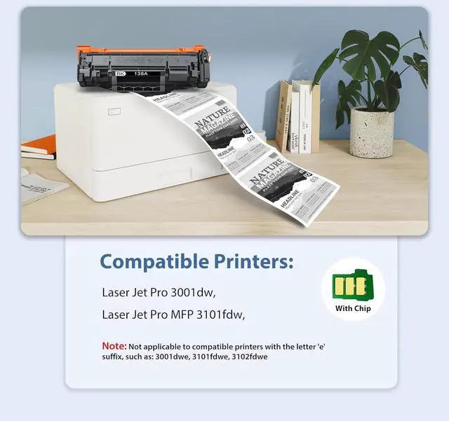 138A Toner Cartridge compatible with HP Laser Jet Pro 3001dw, Laser Jet Pro MFP 3101fdw 3101sdw printer. (Note: Not applicable to compatible printers with the letter 'e' suffix, such as: 3001dwe, 3101fdwe, 3102fdwe.)