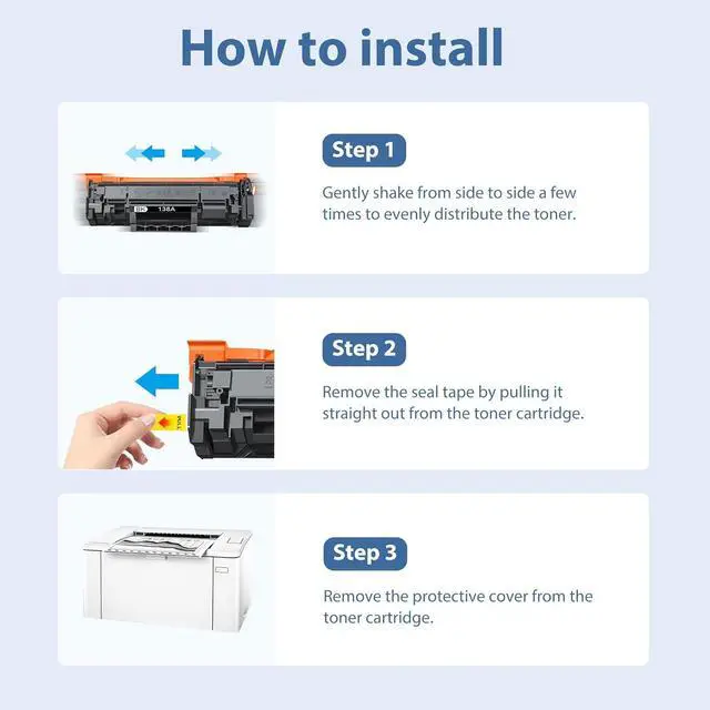 Easy to install your new replacement for hp138A toner cartridge, just follow the instructions and get up and running in minutes. Tip: Avoid touching the green drum, as oil stains on your fingers may affect the print quality.