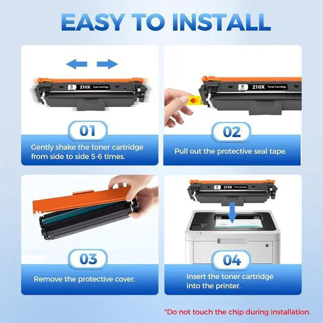 Package Includes: Non-OEM 210X toner cartridges 4 pack with chips, including 1* 210X black toner cartridge, 1* 210X cyan toner cartridge, 1* 210X yellow toner cartridge, 1* 210X magenta toner cartridge