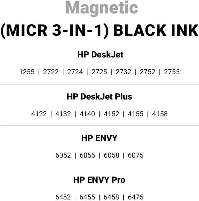 Before placing an order, please be sure to confirm your printer model.This ink cartridge works with: HP DeskJet 1255,2722,2724,2725,2732,2752,2755,HP DeskJet Plus 4122,4132,4140,4152,4155,4158,HP ENVY 6052,6055,6058,6075,HP ENVY Pro 6452,6455,6458,6475.