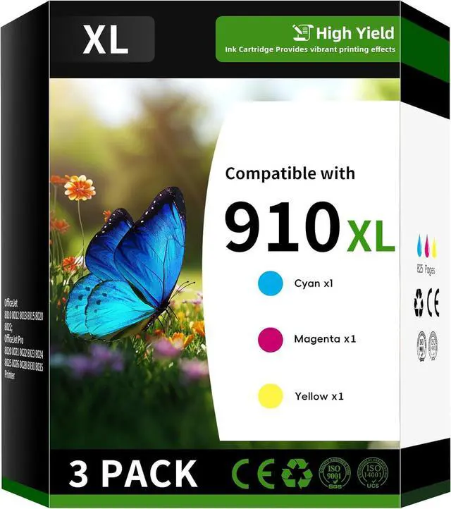 Content Packing: 910XL 3 Pack High Yield Color Ink Cartridge Replacement Compatible with HP910XL HP910 910 XL Ink Cartridge Combo Pack (1 x Cyan 910XL ink, 1 x Yellow 910XL ink, 1 x Magenta 910XL ink)
