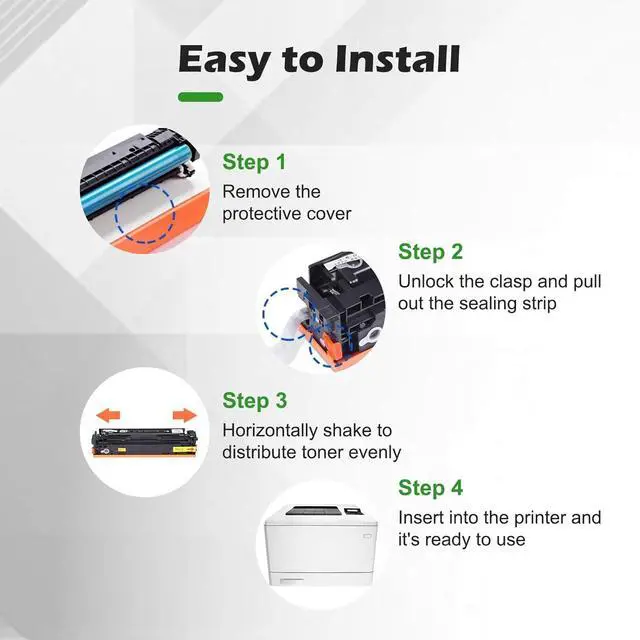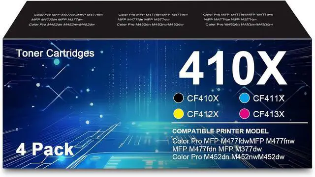 Package Includes: 410X Compatible Toner Cartridge 4 Pack (Black CF410x Cyan CF411x Yellow CF412x Magenta CF413x )