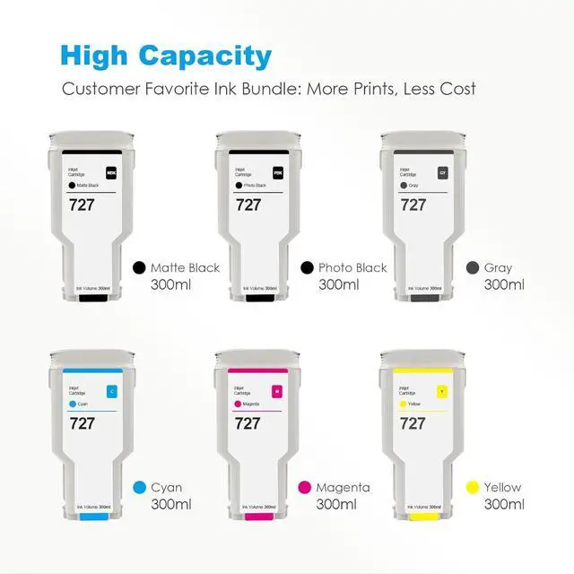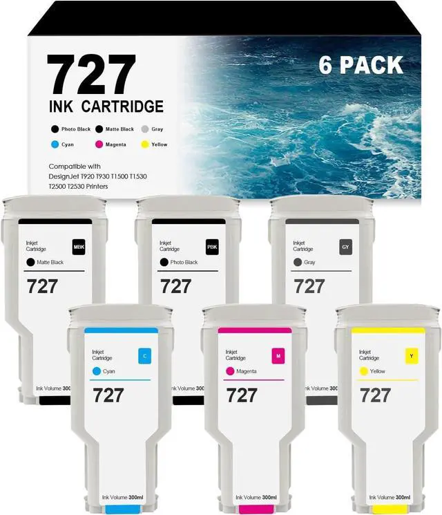 Package Contains:6 Pack Latest upgrade replacement for 727 ink cartridges (300ml Matte Black/Photo Black/Cyan/Yellow/Gray/Magenta)