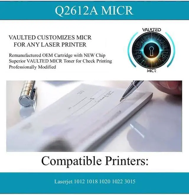 Whats in the Box One (1) VAULTED MICR 12A / Q2612A toner cartridge. 100% performance and satisfaction guaranteed.