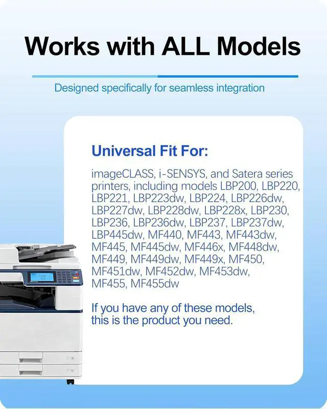 Compatibility: Designed for a seamless fit with Canon imageCLASS, i-SENSYS, and Satera series printers, including models LBP200, LBP220, LBP221, LBP223dw, LBP224, LBP226dw, LBP227dw, LBP228dw, LBP228x, LBP230, LBP236, LBP236dw, LBP237, LBP237dw, LBP445dw, MF440, MF443, MF443dw, MF445, MF445dw, MF446x, MF448dw, MF449, MF449dw, MF449x, MF450, MF451dw, MF452dw, MF453dw, MF455, MF455dw.