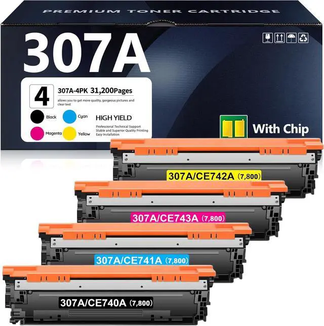 What's in the box: 4 Packs of Compatible Replacement for 307A Toner Cartridges (1x CE740A Black, 1x CE741ACyan, 1x CE742A Yellow, 1x CE743A Magenta)