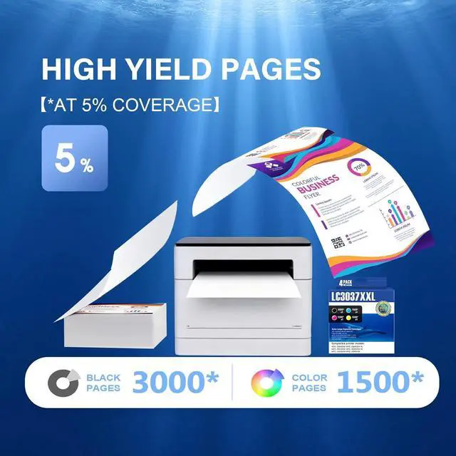 Ultra High-Yield: up to 3,000 pages per LC3037 XXL BK Ink Cartridges, up to 1,500 pages per LC3037 XXL c/m/y ink cartridges (at 5% coverage)