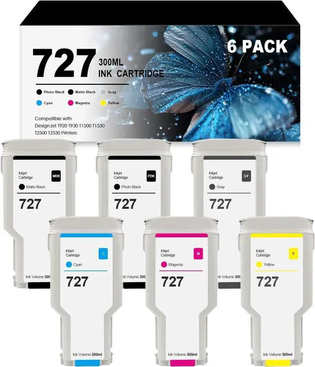 This set contains six individual 727 cartridges, including Photo Black F9J79A Matte Black C1Q12A Cyan F9J76A Magenta F9J77A Yellow F9J78A Gray F9J80A .