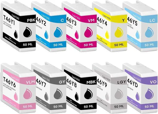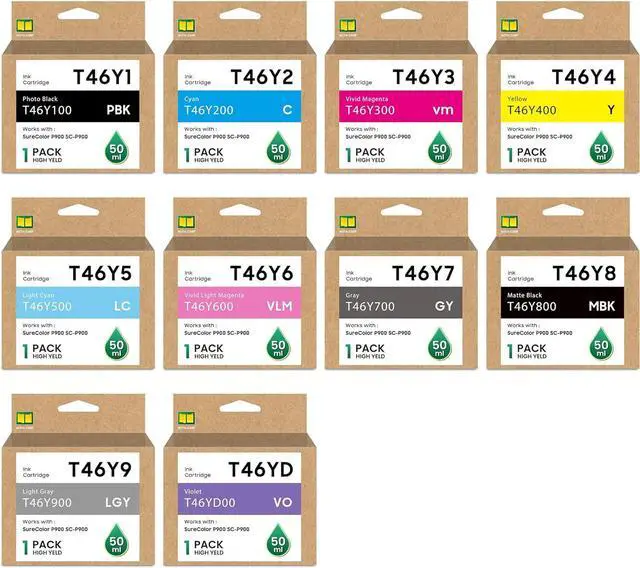 Package includes: 1 x T46Y1 photo black (T46Y100), 1 x T46Y2 cyan (T46Y200), 1 x T46Y3 vivid magenta (T46Y300), 1 x T46Y4 yellow (T46Y400), 1 x T46Y5 light cyan (T46Y500), 1 x T46Y6 vivid light magenta (T46Y600), 1 x T46Y7 gray (T46Y700), 1 x T46Y8 matte black (T46Y800), 1 x T46Y9 light gray (T46Y900), 1 x T46YD violet (T46YD00).