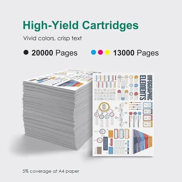 High Page Yield:20,000 pages per black; 13,000 pages per color at 5% coverage of Letter A4.