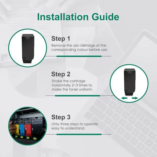 Installation:Before installation,you can shake the toner cartridge up and down or left and right to make the toner cartridge flow well and the product particles uniform.